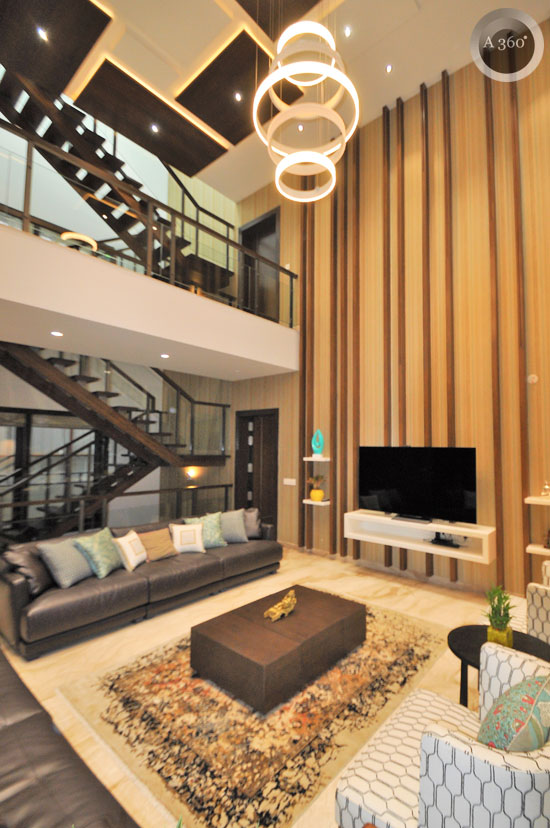 The living room, which is next to the entryway and has a double-height veneered ceiling, greets visitors with its tranquil colors. Moreover, the room features intrusive wall paneling. A large chandelier gives the room flair. The TV unit, which features shelves holding items with duco finishes, brings life to the room. The sleek center table and central rug are signature items, while the black The direction of the bed and the strategic positioning of elements, such as open sections, allow for enough of light while limiting direct heat buildup. The layout of the bedroom and its color palette combine Indian and modern design elements.